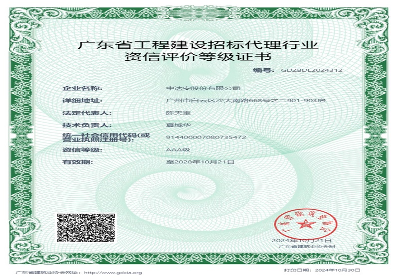 廣東省工程建設(shè)招標(biāo)代理行業(yè)資信評(píng)價(jià)等級(jí)AAA級(jí)